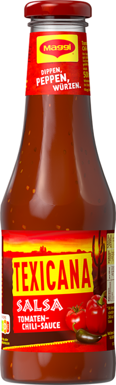 ein weiteres Viertel mit MAGGI Texicana Salsa bestreichen und den Speck darauf geben; das dritte Viertel mit geriebenem Cheddar und das vierte mit Avocado belegen.