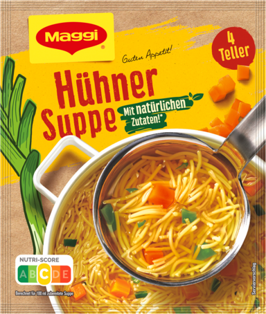 In einem Topf Wasser zum Kochen bringen. MAGGI Guten Appetit Hühner Suppe einrühren und bei geringer Wärmezufuhr 5 Min. kochen. Dabei gelegentlich umrühren.