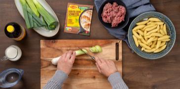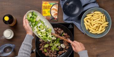 Hackfleisch-Lauch-Pfanne mit Schupfnudeln