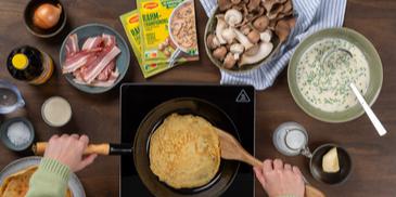 Schnittlauch-Pfannkuchen mit Schinken und Pilzen