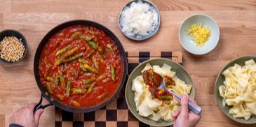 Pasta mit grünem Spargel in Tomatensauce