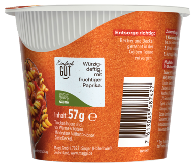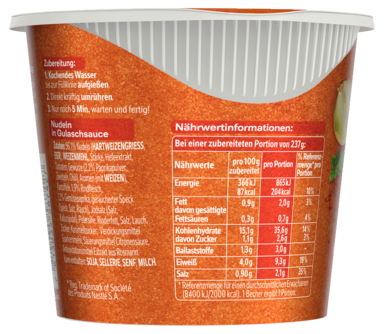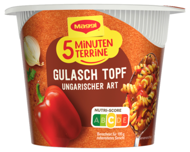 Ein vollgepackter Tag steht an und man hat große Lust auf eine kleine, deftige Mahlzeit? Wie wäre es mit einem herzhaften Pastagericht? Mit der MAGGI 5 Minuten Terrine Gulasch-Topf genießt man in nur fünf Minuten einen leckeren Gulasch-Topf – ungarischer Art, würzig, gut! Ob zuhause, im Büro oder unterwegs, mit der MAGGI 5 Minuten Terrine bereitet man sich ganz einfach, schnell und bequem einen leckeren Gulasch-Topf zu.