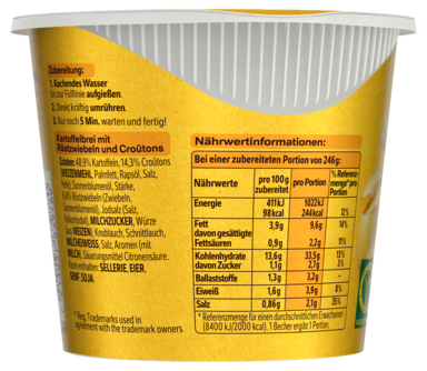 Zutaten: 48,9% Kartoffeln, 14,3% Croûtons (WEIZENMEHL, Palmfett, Rapsöl, Salz, Hefe), Sonnenblumenöl, Stärke, 6,4% Röstzwiebeln (Zwiebeln, Sonnenblumenöl), Jodsalz (Salz, Kaliumjodat), MILCHZUCKER, Würze (aus WEIZEN), Knoblauch, Schnittlauch, MILCHEIWEISS, Salz, Aromen (mit MILCH), Säuerungsmittel Citronensäure. Kann enthalten: SELLERIE, EIER, SENF, SOJA.