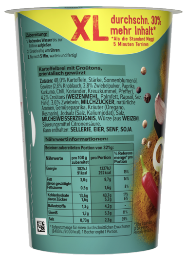 Die MAGGI 5 Minuten Terrine XL Kartoffelbrei Döner Taste ist in kürzester Zeit bequem zubereitet & ideal für jeden Moment, in dem man sich nach einer leckeren, warmen Auszeit sehnt. Das cremige Kartoffelpüree mit knackigen Zwiebeln & Orient-Gewürzen, macht sie immer & überall zu einem echten Genuss.