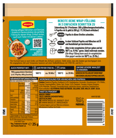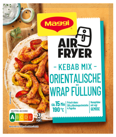 Mit der MAGGI FIX Air Fryer Orientalische Wrap-Füllung Kebab Mix gelingen dir schnell und einfach aromatische orientalische Wraps. Diese feine Würzmischung verleiht Hähnchen und Gemüse den typischen Kebab-Geschmack.