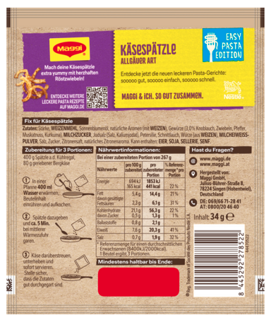 Das MAGGI FIX Käse Spätzle Allgäuer Art der Easy Pasta Edition bringt eine köstliche Kombination aus cremigem Bergkäse, herzhaften Spätzle und fein abgestimmten Gewürzen direkt in deine Küche. Entdecke ein echtes Wohlfühlgericht, bei dem zarte Spätzle, würziger Käse und die perfekt abgestimmte MAGGI-Gewürzmischung zu einem herrlich cremigen Geschmackserlebnis verschmelzen. Die typisch allgäuerische Käsenote verleihen diesem Gericht seinen unverwechselbaren, rustikal-gemütlichen Charakter. Verfeiner dein Gericht mit ein paar Röstzwiebeln.