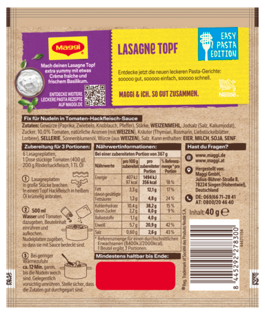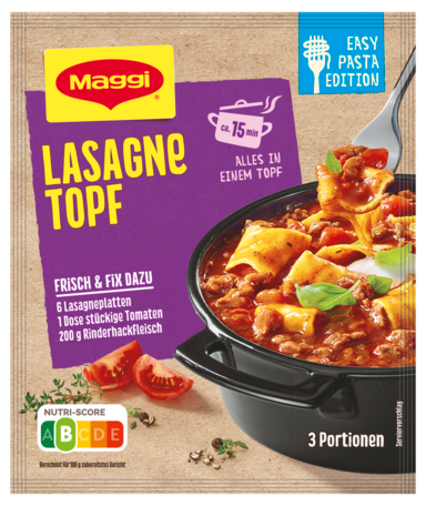 Das MAGGI FIX Lasagne Topf der Easy Pasta Edition bringt eine köstliche Kombination aus zarten Lasagneplatten, saftigen stückigen Tomaten, würzigem Rinderhackfleisch und aromatischen Gewürzen direkt in deine Küche. Entdecke eine Welt voller Genussmomente mit MAGGI Fix für den Lasagne Topf! Hier verschmelzen die herzhaften Zutaten zu einem harmonischen Geschmackserlebnis, das deine Sinne verwöhnt. Die leuchtenden Farben und die perfekt abgestimmte Würzmischung verleihen diesem Gericht nicht nur seinen unverwechselbaren Geschmack, sondern auch eine besondere Raffinesse.