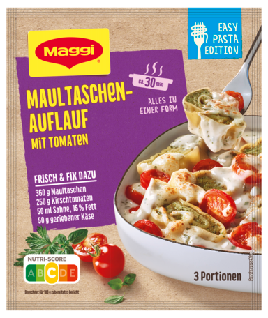 Das MAGGI FIX Maultaschen Auflauf mit Tomaten der Easy Pasta Edition bringt eine köstliche Kombination aus herzhaften Maultaschen, saftigen Kirschtomaten, cremiger Sahne, geriebenem Käse und aromatischen Gewürzen direkt in deine Küche. Hier verschmelzen die zarten Maultaschen, die fruchtigen Tomaten und die cremige Käsesauce zu einem harmonischen Geschmackserlebnis. Die leuchtenden Farben und die perfekt abgestimmte Gewürzmischung verleihen diesem Gericht nicht nur seinen unwiderstehlichen Geschmack, sondern auch eine besondere Raffinesse.
