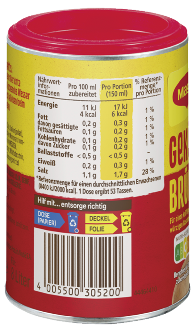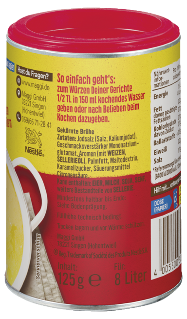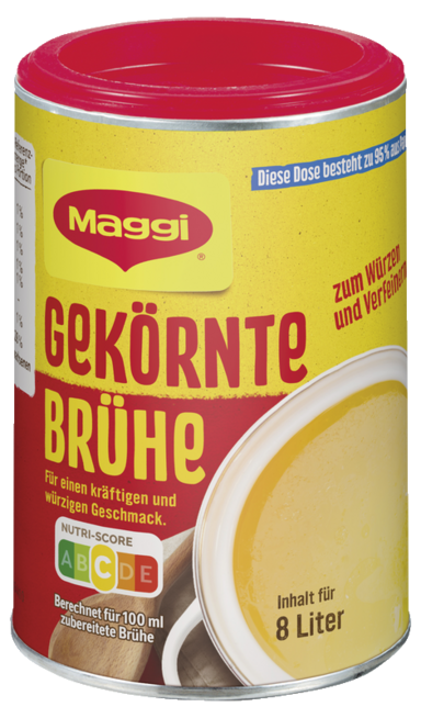 Mit der gekörnten Brühe von MAGGI spart man viel Zeit beim Würzen. Dank der Pulverform ist die Brühe individuell dosierbar und sofort einsatzbereit – für eine größtmögliche Würzfreiheit beim Kochen und Zubereiten. Einfach 2TL Gekörnte Brühe in 500ml kochendes Wasser verrühren und die Wunschgerichte damit abschmecken.