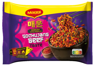 MAGGI Korean Style Noodles Gochujang Beef Im Beutel verbindet scharf-süß-salzige Gochujang-Noten mit Rind-Geschmack und dicken K-Style Noodle. Ein kräftiges, ausgewogenes Aromabild – geeignet als herzhafte, sättigende Mahlzeit.