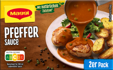 Maggi Pfeffer Sauce passt ideal zu kurzgebratenem Fleisch wie Pfeffersteak. Sie schmeckt aber auch super zu Schnitzeln und Frikadellen. Die Fleischgerichte erhalten mit der Pfeffersauce einen herrlich pikanten und kräftigen Geschmack.