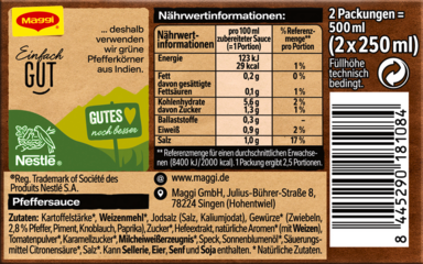 Die Zubereitung der Pfeffersauce ist kinderleicht. Rühre einfach den Inhalt eines Einzelpäckchens Maggi Pfeffer Sauce mit einem Schneebesen in 250ml heißes Wasser oder anfallende Flüssigkeit ein. Sauce aufkochen und 3 Minuten kochen lassen. Verfeinere die Sauce nach Belieben mit Frischkäse, Sahne oder Sherry. Die fertige Pfeffersauce zum Schluss in eine kleine Sauciere füllen oder direkt über das leckere Fleischgericht geben.