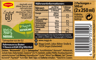 Zutaten: WEIZENMEHL*, 22,5% SAHNEPULVER*, Kartoffelstärke*, Reismehl*, Hefeextrakt, Jodsalz (Salz, Kaliumjodat), Gewürze* (4,4% Zwiebeln, weißer Pfeffer, Knoblauchpulver), natürliche Aromen* (mit WEIZEN), Karamellzucker*, Zucker*, Würze* (aus WEIZEN), Salz*, Sonnenblumenöl*, Paprikaöl*. Kann EIER, SENF, SOJA und SELLERIE enthalten. *Natürliche Zutaten.