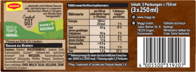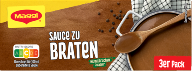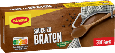 Einfach den Inhalt eines Einzelpäckchens MAGGI Sauce zu Braten in 250ml heißes Wasser oder anfallende Flüssigkeit mit dem Schneebesen einrühren. Sauce kurz aufkochen. Die dunkle Sauce mit Tomatenmark, Senf, Schlagsahne oder Rotwein verfeinern. Fertig! Die leckere Sauce zum Fleischgericht in ein Saucen-Kännchen füllen oder direkt auf dem Teller servieren.