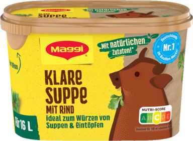 Die Maggi Klare Fleisch Suppe mit Rindsgeschmack ist schnell löslich, hat einen herzhaft-kräftigen Geschmack und enthält natürliche Zutaten. Mit einer Vorratsdose kannst du viele köstliche Gerichte zubereiten. Weitere Rezeptideen findest du auf maggi.de.