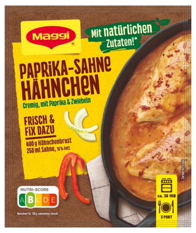 Wasser und Sahne zum Kochen bringen. MAGGI Fix für Paprika-Sahne Hähnchen einrühren, aufkochen und über die Hähnchenschenkel geben. Im Backofen ca. 45 Min. backen. 10 Min. vor Garzeitende mit Aluminiumfolie abdecken.